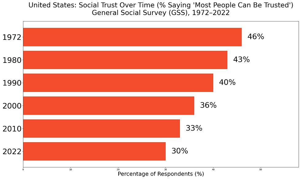 In the early 1970s, nearly half of Americans believed most people could be trusted. Today, that number sits closer to 30%.