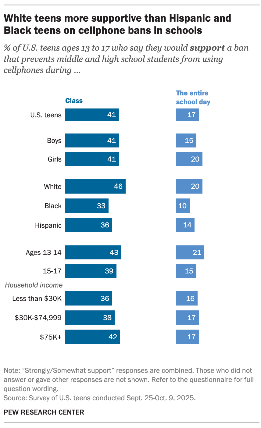 While 46% of White teens say they support banning cellphones in classrooms, that share drops to about a third among Hispanic and Black teens.