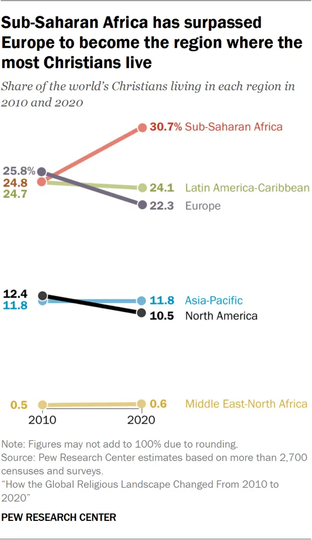 surpassing Europe. As of 2020, about 31% of the world’s Christians live in sub-Saharan Africa, while 22% live in Europe. This change has been fueled by Africa’s much higher fertility rates, but also by widespread disaffiliation from Christianity in Western Europe.